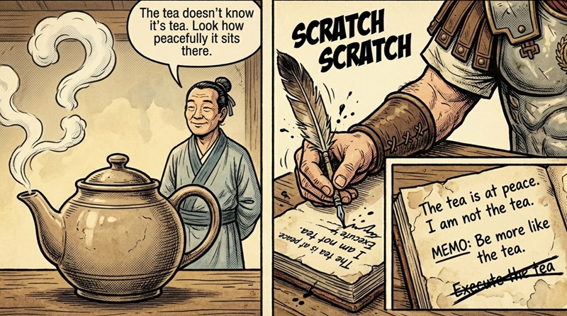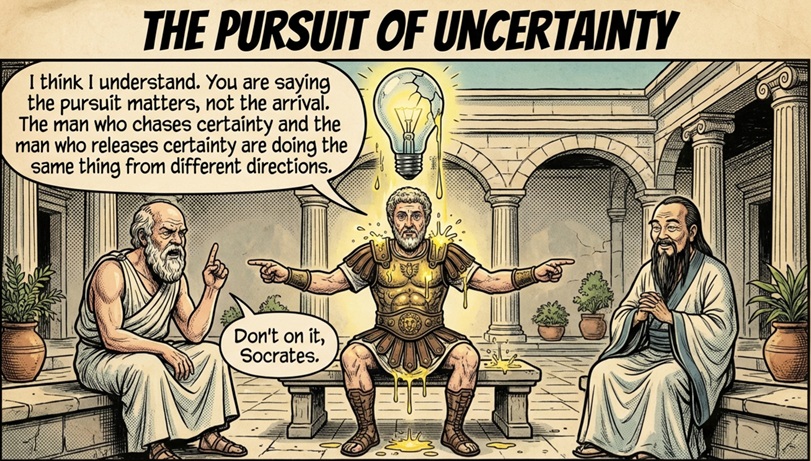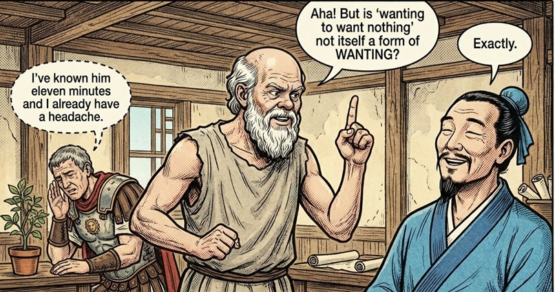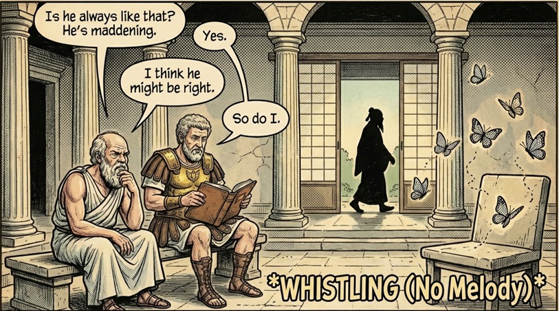 In a restless age defined by distraction and volatility, their combined wisdom feels strikingly contemporary. We confront external forces beyond our control, moral confusion amplified by noise, and relentless striving that exhausts rather than fulfills. The emperor counsels composure, the gadfly demands clarity, and the Daoist sage invites lightness. None alone is sufficient. Together they form a resilient architecture of the self.