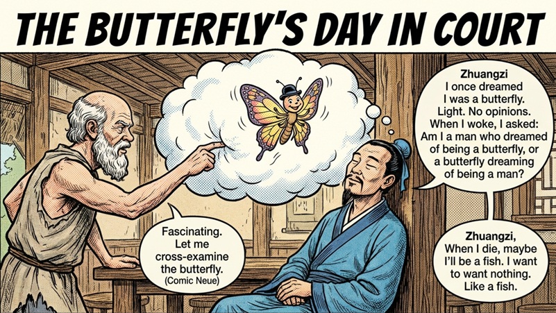 Where Socrates sharpens and Marcus steadies, Zhuangzi dissolves. Writing in the turbulence of ancient China’s Warring States period, he crafted parables that subvert fixed distinctions and mock rigid certainty. In the text that bears his name, often referred to as the Zhuangzi, he invites readers into a world where perspectives shift as fluidly as wind through trees. The famous dream of the butterfly blurs the boundary between self and other, waking and dreaming, certainty and illusion. The point is not skepticism for its own sake, but liberation from cramped thinking.