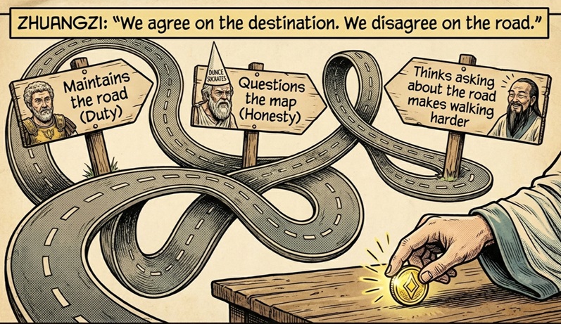 Taken together, these three philosophies trace complementary arcs of development. Socrates insists that we interrogate our assumptions. Without examination, we drift in borrowed beliefs. Marcus teaches that once we discern what is right, we must train the will to enact it despite adversity. Without discipline, insight collapses under pressure. Zhuangzi reminds us that even discipline can calcify into rigidity. Without spaciousness, virtue becomes self-righteousness and inquiry becomes anxiety.